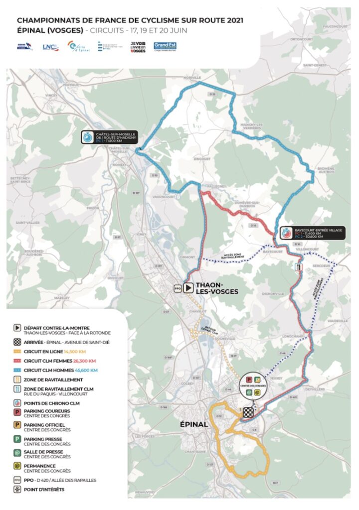 Les championnats de France de cyclisme 2021 se déroulent du 17 au 20 juin à Epinal (Vosges), sur un parcours annoncé comme difficile. Sur le circuit de 14,5 km de la course en ligne (à parcourir à 7 reprises pour les femmes, soit 101,5 km, et à 16 reprises pour les Elites hommes, soit 232 km), se répéte une montée de 2,5 km à 6 % de moyenne, à laquelle s’ajoute un long faux plat de plus d’un kilomètre pour atteindre la ligne d’arrivée. Retrouvez le détails des parcours route et CLM, le programme, et les listes des engagés des courses au maillot tricolore.