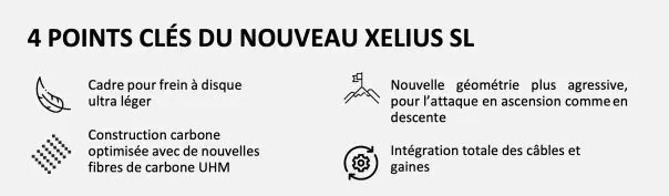 « Le nouveau Xelius SL est une évolution technologique du SL deuxième génération. Le rapport rigidité-confort a été optimisé tout en améliorant l’aérodynamisme et le poids pour répondre aux demandes des coureurs. L’évolution de sa géométrie permet de rouler à haute vitesse en toute sécurité tout en préservant une excellente maniabilité. Enfin, avec l’ensemble de sa câblerie complètement intégrée, le nouveau Xelius SL affine l’ensemble de ses lignes en devenant une machine très épurée. »