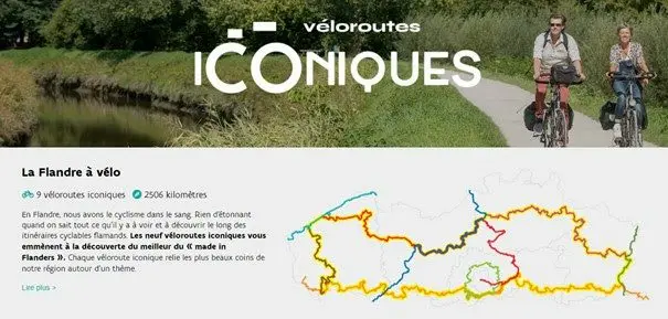 De concert avec les cinq organisations responsables du tourisme dans les provinces flamandes, l’office de tourisme a développé 9 véloroutes thématiques iconiques afin de promouvoir la Flandre en Belgique et à l’étranger en tant que destination de vacances cyclistes. Ce faisant, en collaboration avec les cyclistes, les offices du tourisme, le secteur de l’hébergement, les voyagistes et les fournisseurs de services cyclistes, le produit « Vacances cyclistes en Flandre » est hissé à un niveau supérieur. Les véloroutes iconiques sont les traits d’union entre les incontournables du paysage flamand par le biais d’itinéraires cyclables attrayants et articulés autour de thèmes forts qui permettent aux gens de découvrir le meilleur de la Flandre à vélo. Avant l’été 2021, la Route vallonnée et la Route de la Flandre seront également présentées.