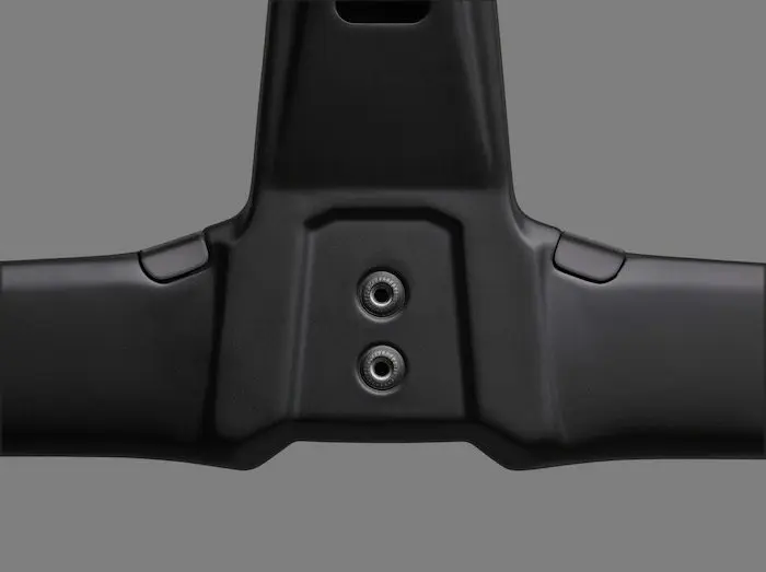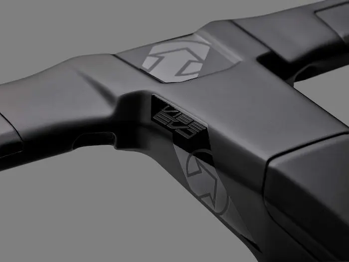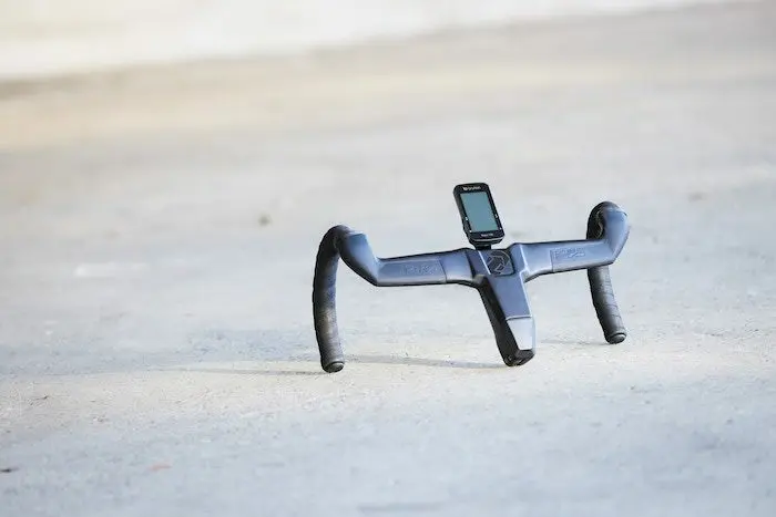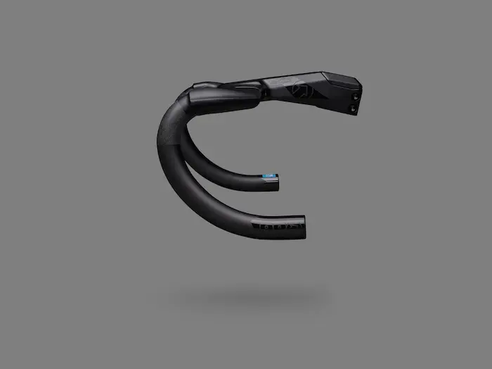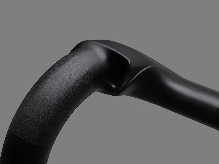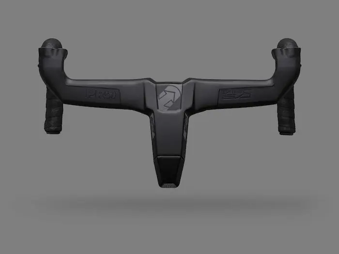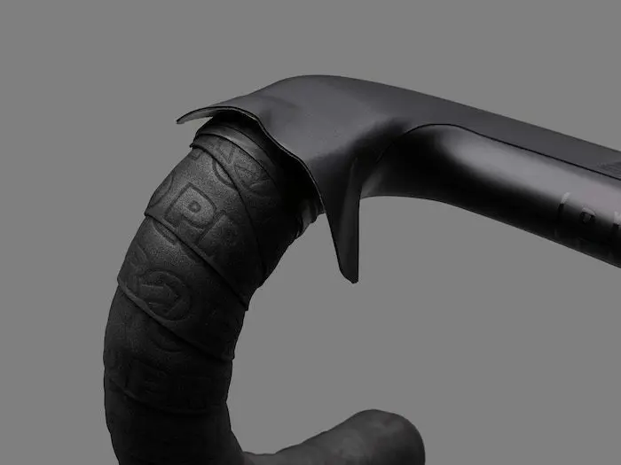 Pour allier confort et aérodynamisme, PRO opte pour un grip autocollant en caoutchouc intégré à la forme de la partie supérieure du guidon, qui a l’avantage d’offrir de l’adhérence sans modifier la ligne et sans affecter la pénétration dans l’air avec une couche de ruban supplémentaire. Ce grip se prolonge jusque sous les cocottes des poignées, et peut bien sûr être changé en cas d’usure.