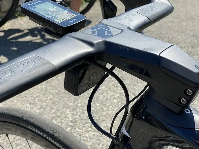 PRO propose avec le Vibe Evo plusieurs options d’intégration, ce qui le rend compatible avec presque tous les vélos du marché. Les gaines ou durites de freins, ainsi que les câbles ou fils électriques de dérailleurs cheminent d’abord des poignées jusque près de la potence à l’intérieur du guidon, où ils peuvent ressortir dans le cas d’un montage traditionnel. Dans ce cas, les fils électriques du Di2 peuvent continuer à évoluer à l’intérieur de la potence pour passer ensuite près du pivot de fourche, avec un boîtier de jonction placé à l’extrémité de la partie basse du guidon.