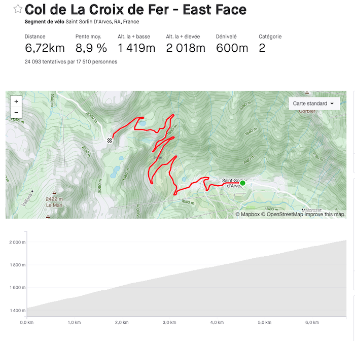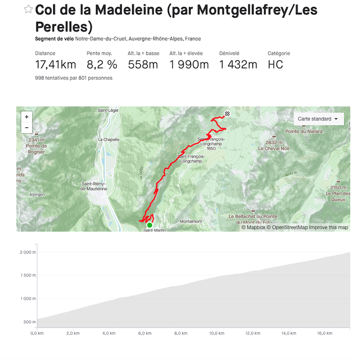 À Saint-Martin-de-la-Chambre, c’est parti pour lâcher ses dernières forces : ici il vous reste 17,5 km pour quasiment 1500 m de D+. Pas besoin d’en rajouter plus, cela va être dur, d’autant que c’est selon moi le versant le plus dur de la Madeleine, avec de longs passages à 9/10 % voire plus, alors même si Colbrelli faisait le train du peloton un long moment en 2020, croyez moi c’est dur… un petit replat pour arriver à Saint-Francois-Longchamp, puis s’en terminera au sommet après 5 km de toute beauté dans les pâturages. On a hâte d’arriver là haut à 2000m ! https://www.strava.com/segments/24624092?filter=overall