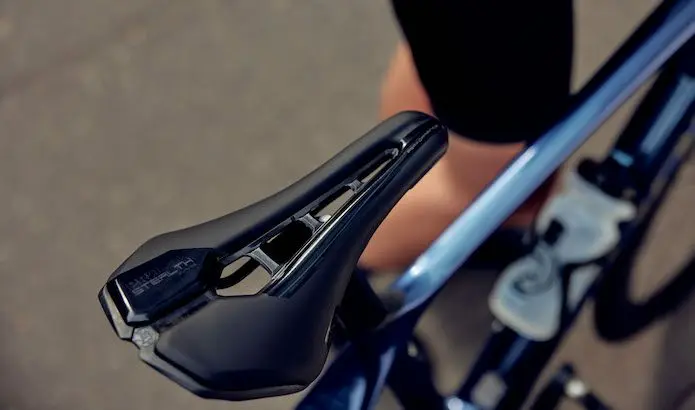 Le bec de la Stealth Curved est plus étroit que la Stealth, mais aussi légèrement plus large que celui d’une Specialized Power. Par rapport à cette dernière, la transition entre le milieu de la selle et le croissant est aussi un peu plus doux, ce qui explique que le bassin est un peu moins verrouillé dans une position fixe. L’appui au niveau du croissant est également moins ferme, ce qui est sensible en adoptant pendant une bonne heure une position relevée avec les mains en haut du cintre.