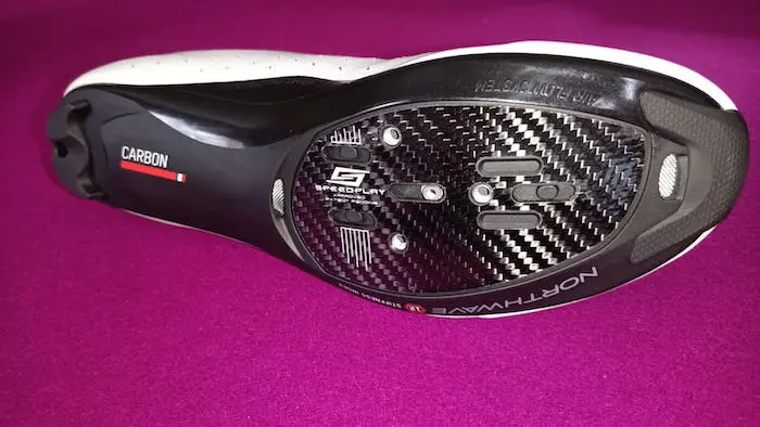 Ce n’est évidemment pas la seule des caractéristiques à prendre en compte pour ces chaussures de milieu/haut de gamme vendues à 199 €. Elles allient maintien et confort grâce à une empeigne souple qui épouse la forme du pied lors du serrage, un support de voûte plantaire rigide qui stabilise le pied lors des phases d’appui, un serrage précis avec deux boucles micro-métriques et une rétention du talon assurée par une texture adhérente au niveau du rembourrage. La semelle extérieure n’est pas excessivement rigide, et bénéficie d’un indice de rigidité de 12 sur 15 dans la nomenclature Northwave. Elle est composée de nylon renforcé de carbone, avec un insert supplémentaire en carbone au niveau de l’emplacement de la cale, de manière à assurer le transfert de puissance mais sans toutefois interdire une légère torsion de l’ensemble de la chaussure intéressante lors des efforts au long cours. Les Northwave Revolution 2 sont bien sûr compatibles avec les systèmes de pédales avec une fixation à trois points (Look, Shimano), mais aussi avec le système à quatre points Speedplay sans qu’il soit nécessaire de placer une cale de rehausse. Ceci est d’autant plus intéressant que les Northwave sont très peu cambrées (peut-être les moins cambrées du marché) et qu’elles promettent un pédalage « à plat », apprécié par certains pratiquants.