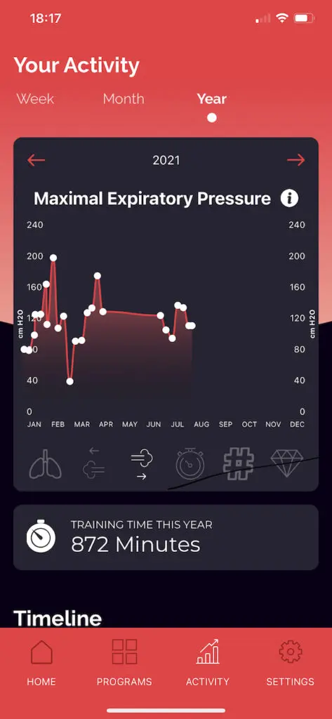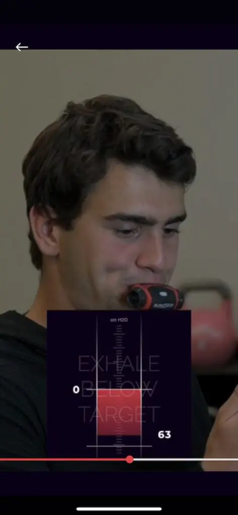 Ensuite, on choisit soit des simples exercices, soit un programme consistant à améliorer l’endurance, la force respiratoire, la capacité anaérobie, ou même la capacité pulmonaire. Chaque programme propose une suite de 24 à 70 exercices, que l’on peut calibrer ensuite sur une à 10 minutes, sans interruption. Il existe trois niveaux de difficulté (débutant, intermédiaire et expert) qui modifient pour un même exercice la résistance à régler sur l’appareil, le niveau d’inspiration ou d’expiration, ou plus difficile encore le temps de soutien en retenant sa respiration. Pour améliorer la capacité pulmonaire ou la capacité anaérobie par exemple, il faut pouvoir se retenir de respirer jusqu’à 30 secondes après avoir vidé ses poumons. La sensation de malaise n’est jamais très loin.