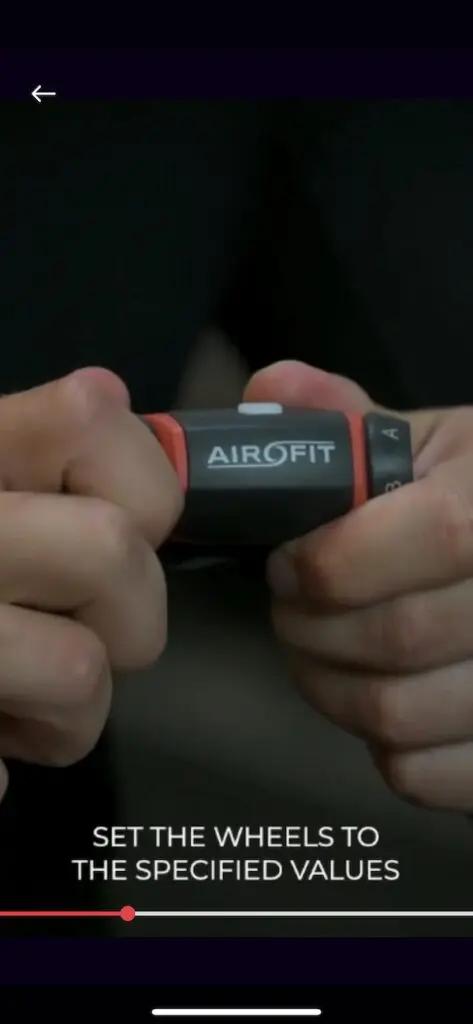 L’Airofit Pro est un petit appareil léger en plastique, avec un embout à placer dans la bouche (disponible en deux tailles), et qui dispose de deux valves réglables (une pour l’inspiration, l’autre pour l’expiration avec six niveaux) pour la résistance. Il est relié par Bluetooth à une application smartphone qui permet de :