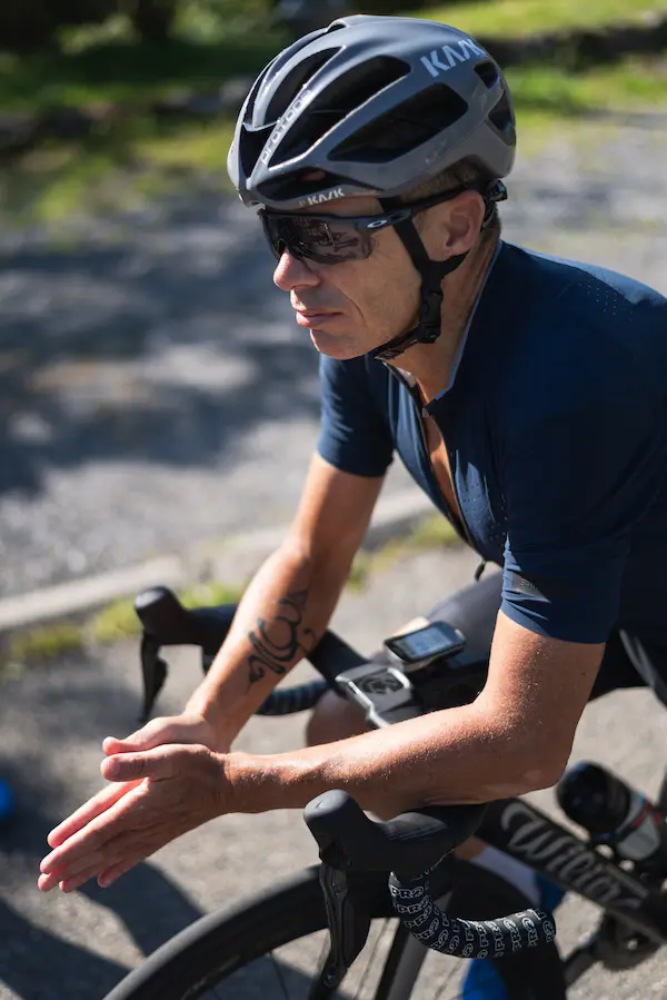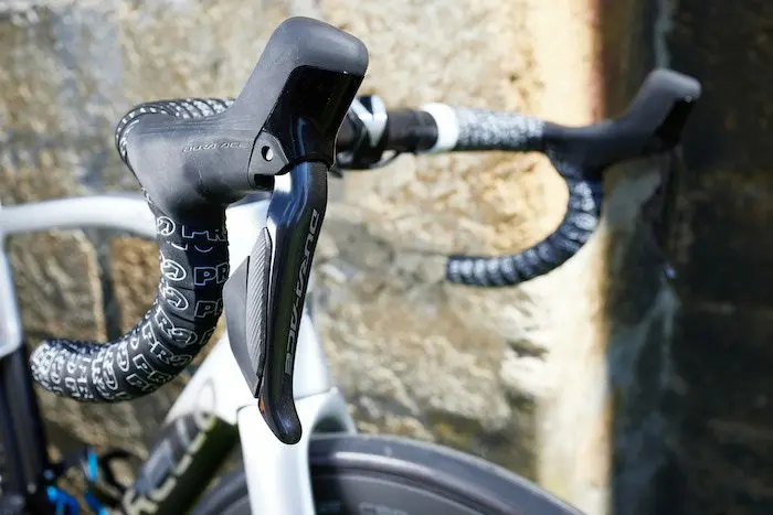 La partie légèrement courbée vers l’intérieur du haut de la poignée ne modifie pas les sensations lorsqu’on se met en danseuse ou lorsqu’on roule simplement avec les mains sur les cocottes, mais se révèle intéressante si on choisit d’adopter une position aérodynamique avec les coudes posés sur le guidon. Il est ainsi possible de conserver les mains posées sur le haut des poignées, tout en rentrant légèrement les coudes pour plus d’efficacité face au vent. Concernant les boutons de changements de vitesse, le léger décalage supplémentaire apporté au plus petit (celui qui est généralement utilisé pour descendre les pignons sur la cassette) est sensible et évite les erreurs de manipulation, aussi bien avec les mains posées sur les leviers qu’avec les mains en bas du cintre.