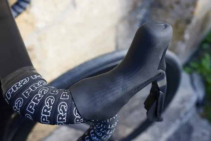 Le corps plus long de la manette par rapport à la version 11 vitesses est un atout pour les grandes mains. Pour les autres, il peut être utile de modifier légèrement l’angle de réglage des poignées sur le cintre, de manière à ne pas se sentir plus allongé sur le vélo, avec les mains en appui sur les cocottes.
