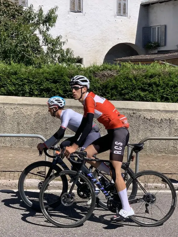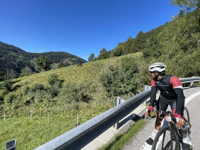 Après le Tonale il faut relier l’arrivée, après la fin du chrono sur le bas de la descente du Vallès. Une longue transition dans une vallée, très belle et verdoyante, mais avec beaucoup de circulation… Ce n’est pas le moment le plus plaisant de cette Haute Route.