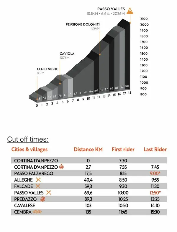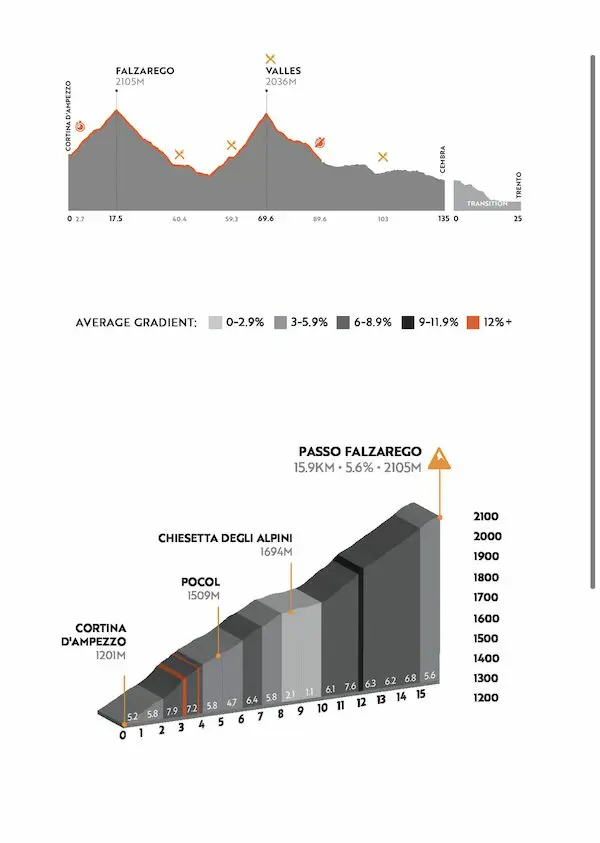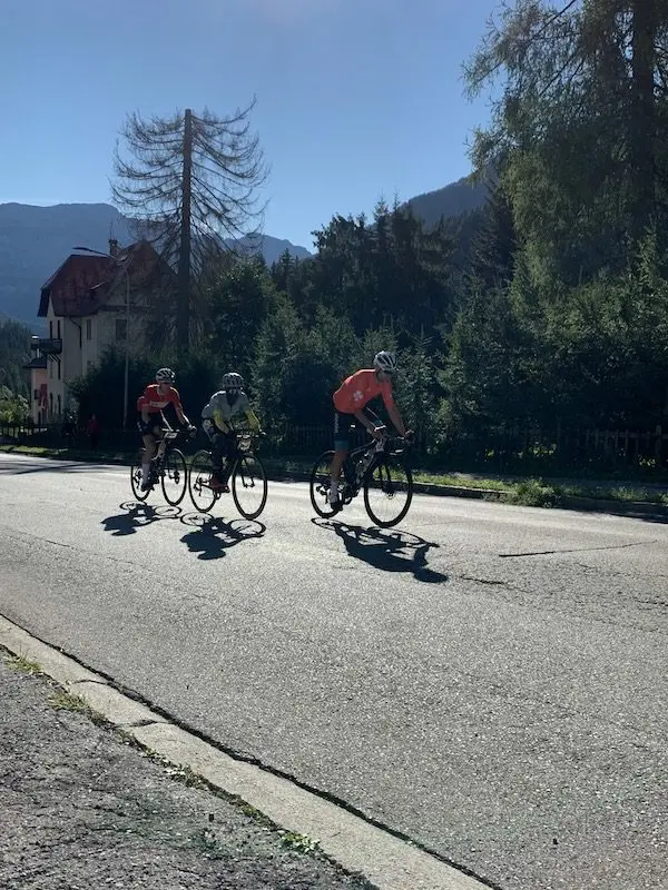 Cette étape relie Cortina à Trento, avec 160 km dont 80 chronométrés par le Passo Falzarego puis le Passo Valles pour principales difficultés. Avec un départ plutôt rapide dans les rues de Cortina, je flâne un peu trop derrière et je dois boucher un petit trou au pied du col. Le col se monte à bon rythme sans trop entamer les réserves.