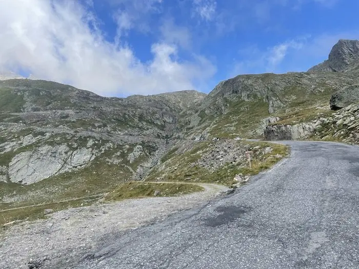 Dans la condition où je suis, ces arrêts ne m’avantagent pas… Mais on fait avec… Certains en profitent pour s’arrêter de longues minutes. Je repars et essaie de tenir un rythme. Rapidement, il m’est impossible de tenir le moindre effort, je me résigne à admirer les paysages, car ce n’est pas tous les jours qu’on grimpe au Gavia ! Je m’en souviendrai de ce Gavia… Crevaison en 2015, la pluie glaciale en 2018 et en 2021 des jambes restées à l’hôtel…