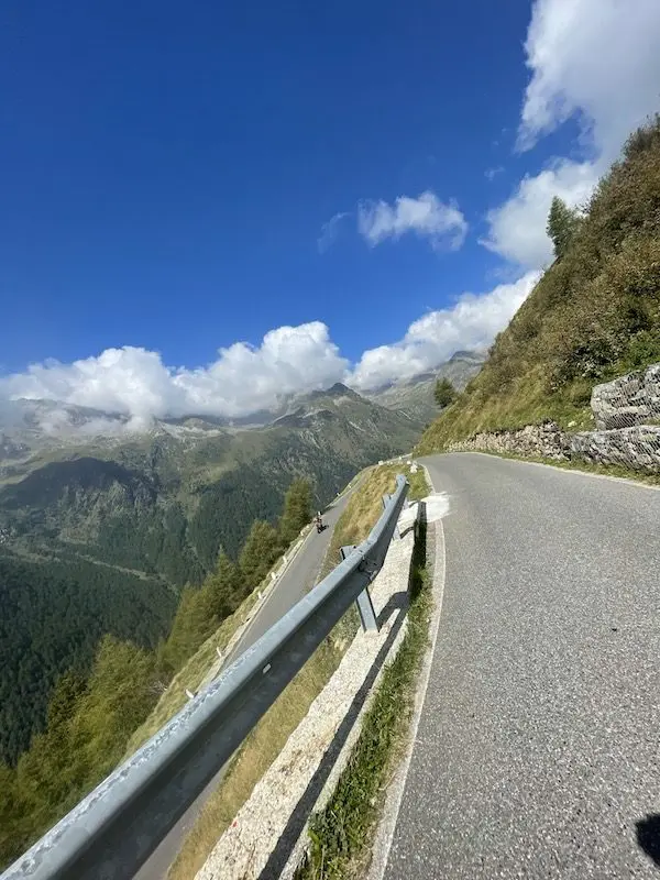 Je laisse un peu du jus mental et physique. Cette vallée me paraît interminable… On aborde le Passo Tonale avec trois minutes de retard minimum sur la tête. Paolo et un italien impriment un bon tempo sur le pied, et je lâche prise à mi-pente. Je sens que le mental et le physique sont en train de me lâcher pour cette étape… Petit à petit, je n’arrive plus à appuyer. Je m’accroche au reste du groupe avec cette sensation étrange d’appuyer sans le faire, et que pas grand chose ne se dégage.