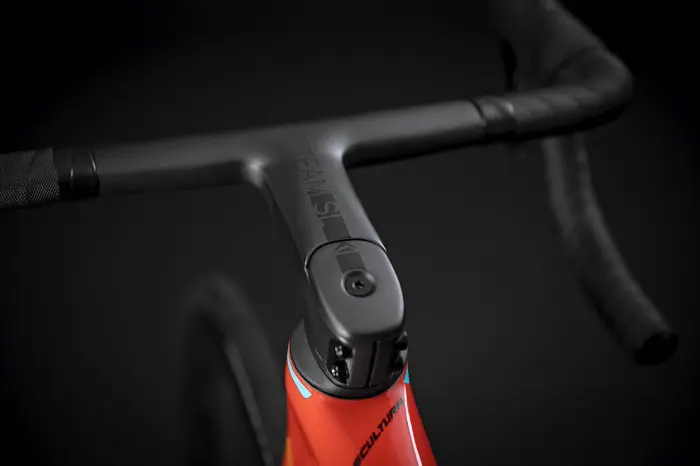 Ce 5ème opus de la lignée des Scultura a ainsi cherché à gagner quelques grammes d’un côté (4% de poids gagné avec le cadre le plus haut de gamme en fibre de carbone CF5, soit 822 g sur la balance en taille M), 10w environ watts de l’autre en trainée aéro par rapport à l’ancienne version, sans oublier de préserver la musculature de son utilisateur avec une rigidité verticale du tube de selle qui passe de 111 N/mm à moins de 80 N/mm et un tube de selle raccourci de 40 mm permettant ainsi une plus grande flexion de la tige de selle.