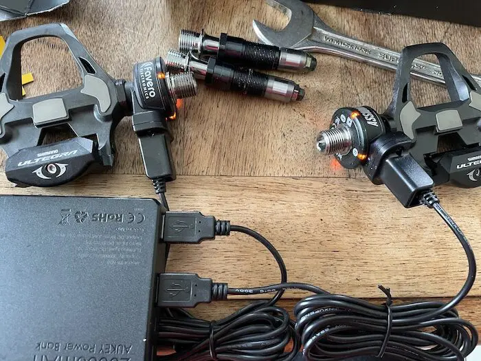 Au déballage – contrairement aux modele Duo pour pédales Look – vous n’aurez que les axes avec capteurs, ainsi qu’une clé et les chargeurs correspondants aux pédales, ainsi que la notice explicative. Le prix est de 594 €. Ces axes sont compatibles avec les corps de pédale suivants : Shimano® PD-R8000, PD-R7000, PD-6800, PD-R550 et PD-R540. Donc, il vous faudra soit avoir en votre possession une de ces paires de pédales, soit en acquérir une. Les Ultegra sont à 149 € prix public. Ce qui porte donc à 743 € le prix des pédales avec le corps Ultegra. Il faut bien noter que les Assioma ne sont pas compatibles avec les pédales Dura-Ace, le corps étant plus fin.