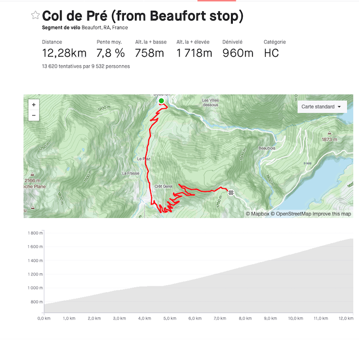 – Le Col du Pré depuis Beaufort : 12,2 km a 7,8 % avec les 6 derniers entre 9 et 11 %