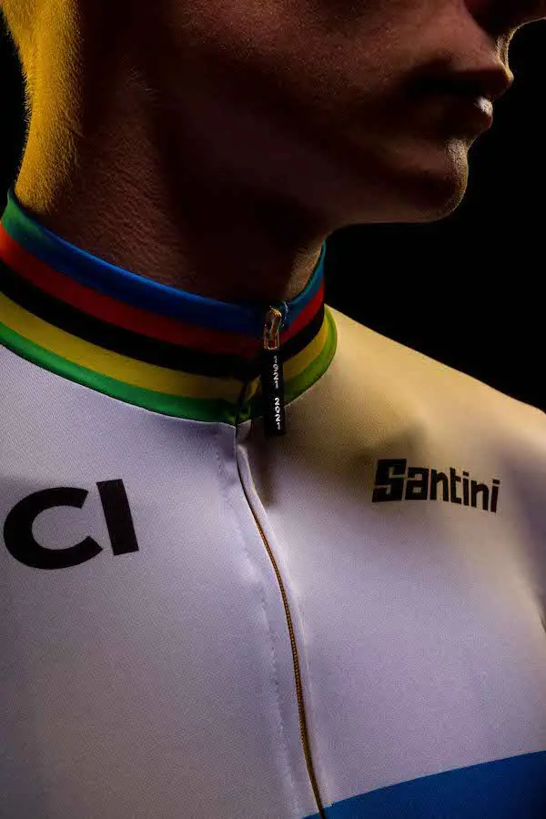 Le maillot le plus convoité, celui de Champion du Monde, est proposé par Santini dans une version unique et en édition limitée. Seulement 1 000 exemplaires numérotés sont disponibles pour célébrer le 100e anniversaire des Championnats du Monde sur route de l’UCI. Chaque maillot est numéroté et agrémenté de détails dorés comme le zip, l’étiquette sur le côté, qui indique également le numéro de maillot, et l’étiquette brodée au centre des poches arrière qui raconte le siècle d’histoire des Championnats du Monde sur route de l’UCI. Ce maillot est respectueux de l’environnement : il est entièrement réalisé dans du Polartec® Power Dry Recycled, un tissu issu de fils de PET recyclé. Disponible à l’achat sur le site www.santinicycling.com et dans une sélection de magasins à travers le monde, il est livré dans un coffret collector.