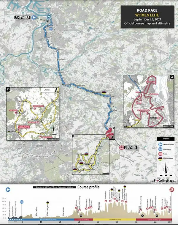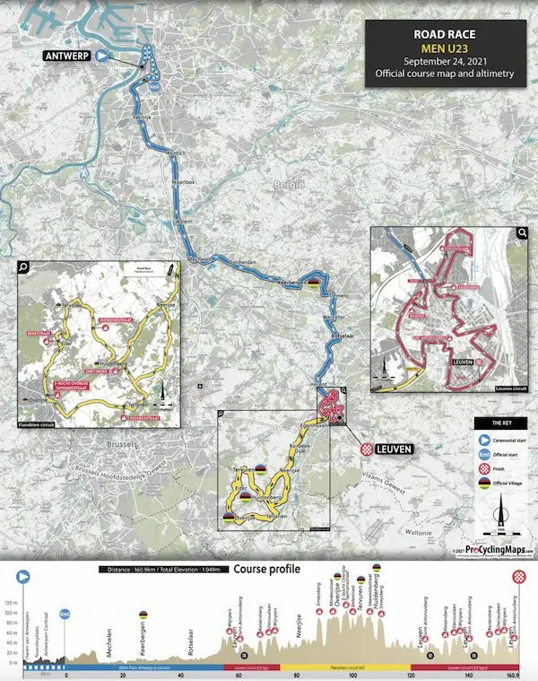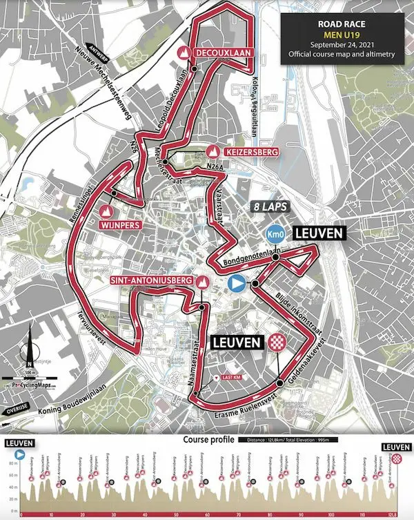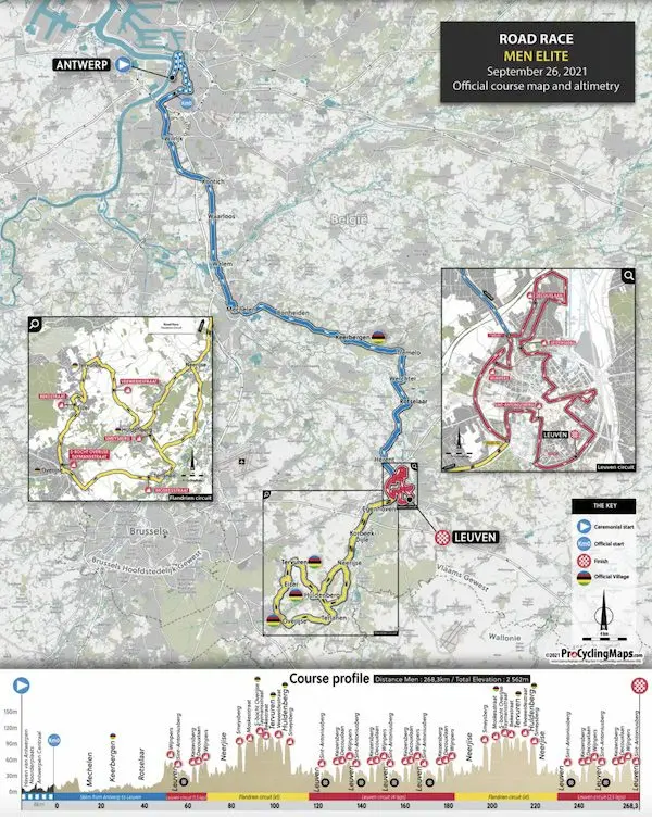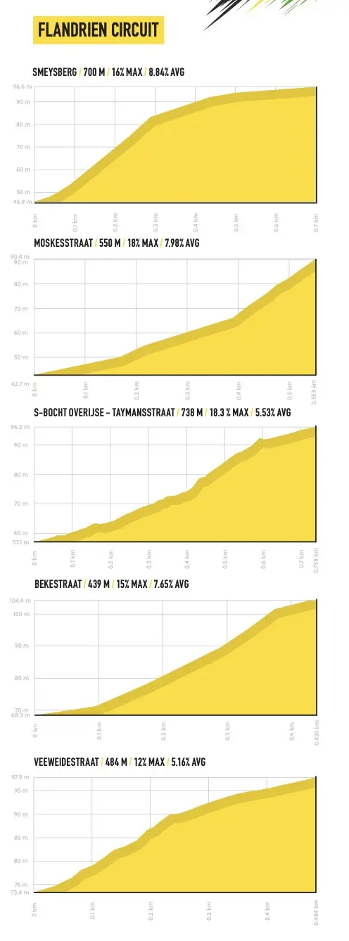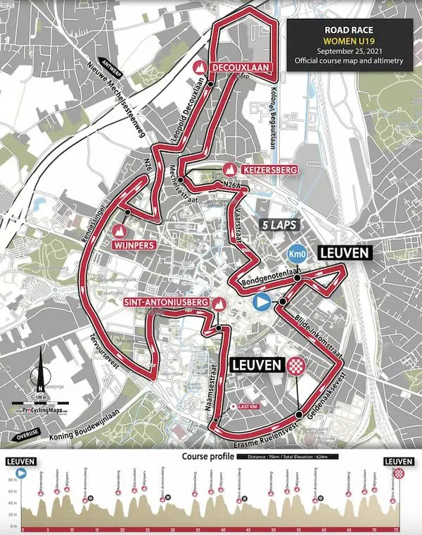C’est une formule originale que propose l’organisation des championnats du monde 2021, avec des courses qui combineront une partie en ligne puis deux circuits entre Anvers et Louvain : un premier circuit autour de Louvain avec les courtes ascensions du Sint Antoniusberg, du Keizersberg, de la Decouxlaan et du Wijnpers, et un circuit renommé circuit flandrien avec des difficultés renommées, le Smeysberg (690 m à 6,8% de moyenne), la Moskesstraat (500 m à 9,1% en pavés), la Taymansstraat, la Bekestraat et la Veeweidestraat.