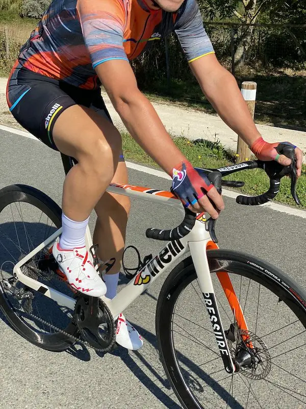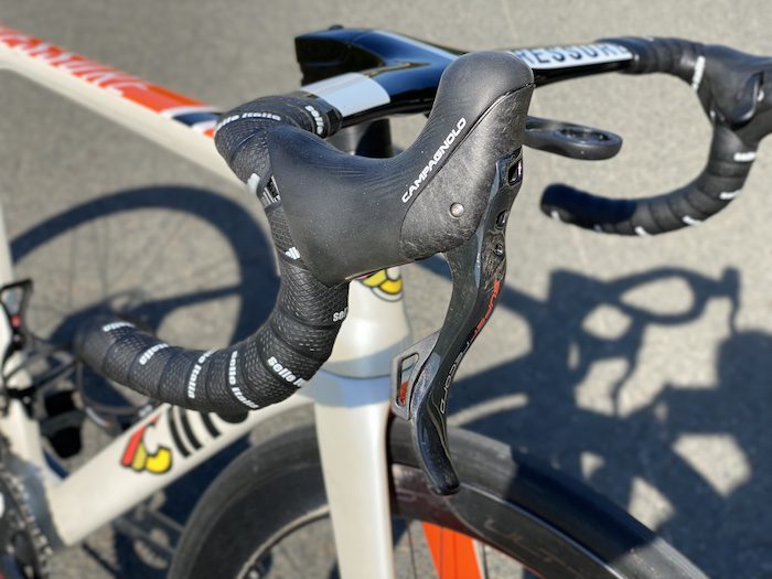 Sur la route, le Campagnolo Super Record EPS Disc fait oublier ces inconvénients. Il s’avère fidèle à sa réputation, sans la moindre anicroche. Le fonctionnement est doux et silencieux au niveau de la transmission, avec un minimum de bruits, même si notre version d’essai a déjà parcouru quelques milliers de kilomètres. Même s’ils ne sont pas forcément recommandés, tous les croisements de chaîne sont possibles, et on peut s’amuser à rouler avec le grand plateau et le grand pignon de 32 dents comme Tadej Pogacar dans le col de la Colombière sur le dernier Tour de France, sans sentir de résistance. Avec le petit plateau et le pignon de 11, seuls les claquements de chaîne contre la base arrière sont audibles. Les changements de vitesse deviennent rapidement intuitifs, et on se surprend à jouer souvent du dérailleur, à la moindre variation de pente. Surtout que la cassette est correctement étagée dans cette configuration 11-32. De 11 à 19, la suite de développements est classique, donc idéale pour la plupart des utilisation sur un terrain vallonné, et c’est sur le haut de la cassette que l’on peut ressentir plus de trous entre les pignons, mais sans que ce soit vraiment rédhibitoire compte tenu de la vitesse de déplacement liée à l’utilisation de ces dentures. Au niveau du passage des plateaux, c’est là aussi souple et silencieux, mais cela semble un poil moins puissant et rapide qu’avec du Shimano.