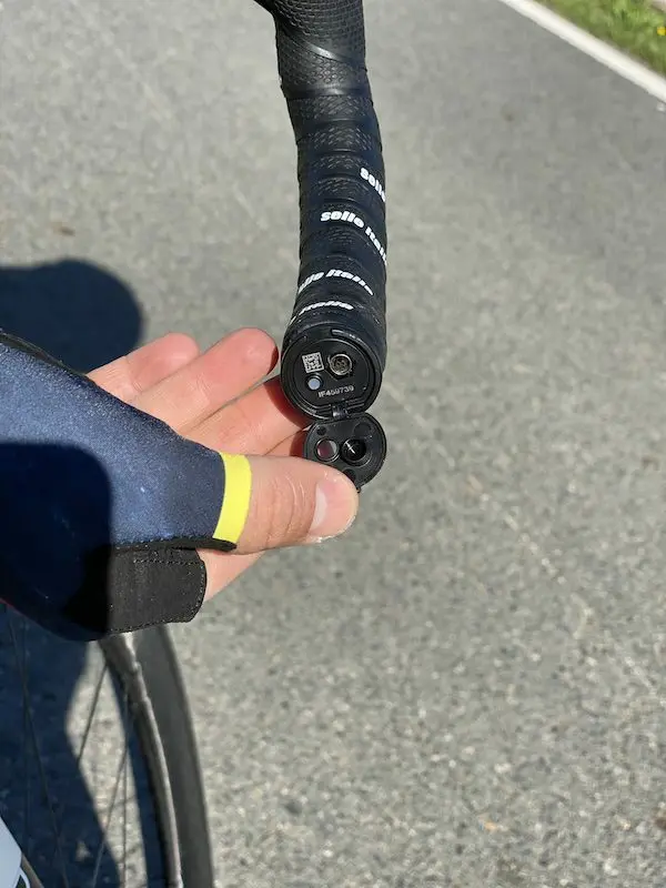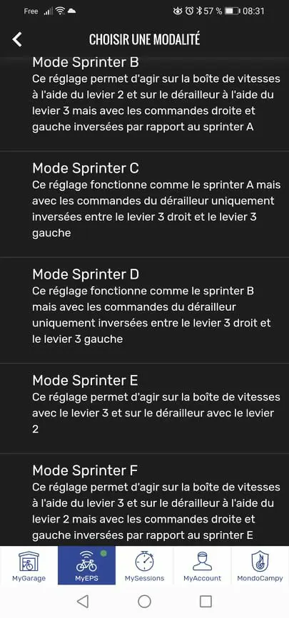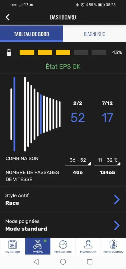 Sur cette dernière génération d’EPS, l’interface migre de sous la potence à un logement prévu dans le tube diagonal du cadre ou comme ici sur le vélo d’essai au bout du cintre. Campagnolo conserve des fils électriques, alors que ses deux concurrents Sram et Shimano – plus récents il est vrai – s’en affranchissent, au moins au niveau du poste de pilotage. Le poids de l’interface, de la batterie et des fils est annoncé à 168 g. L’interface est capable de communiquer en Bluetooth et ANT+, avec un téléphone ou un compteur. Avec l’application MyCampy, il est possible de personnaliser les commandes des leviers de dérailleur (par exemple pour les inverser), télécharger et installer un nouveau micrologiciel, exécuter un diagnostic de chacun des composants, connaitre l’état de charge de la batterie, vérifier les intervalles d’entretien, ou paramétrer les changements de vitesse séquentiels, comme pour Shimano et Sram.