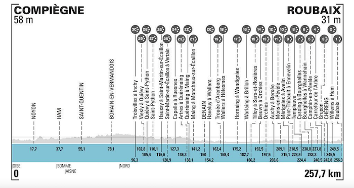 Le parcours et le profil de Paris-Roubaix 2021 (258 km, 30 secteurs pavés)