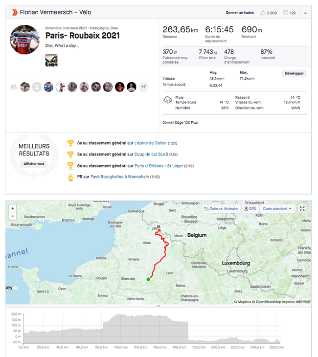 Bien que le terrain et la météo aient été moins favorables pour la course hommes, l’analyse des données Strava permet d’observer qu’elle a été plus rapide de 3,5 km/h que le roi des pavés Florian Vermeersch (2e au général). Ce dernier réalise une performance exceptionnelle pour sa première participation à 22 ans au Paris-Roubaix en enregistrant la meilleure vitesse sur les 30 segments de pavés : 38,5 km/h pour 1h 23 minutes 16 secondes.