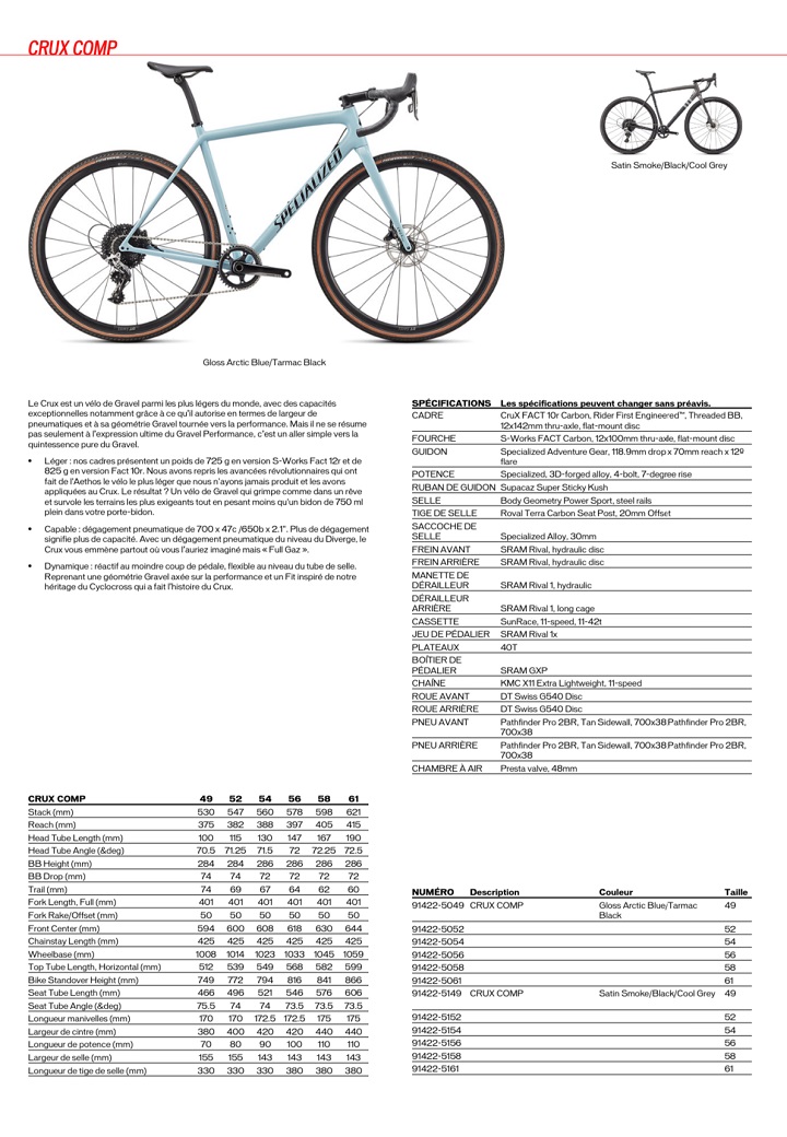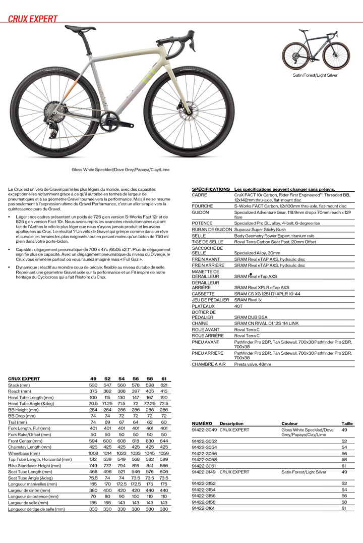Ainsi, à la manière de la gamme route qui offre 2 propositions (SL7 pour la performance tout terrain ou Aethos pour le poids et les ascensions), la gamme gravel offre la possibilité de jouer sur la performance pure (Diverge) ou le poids (le Crux qui nous intéresse ici).