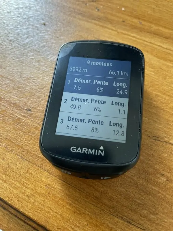 C’est une fonction que j’ai découverte sur le 1030 Plus. Une fois un parcours enregistré au préalable, le compteur va détecter les montées et vous indiquer :