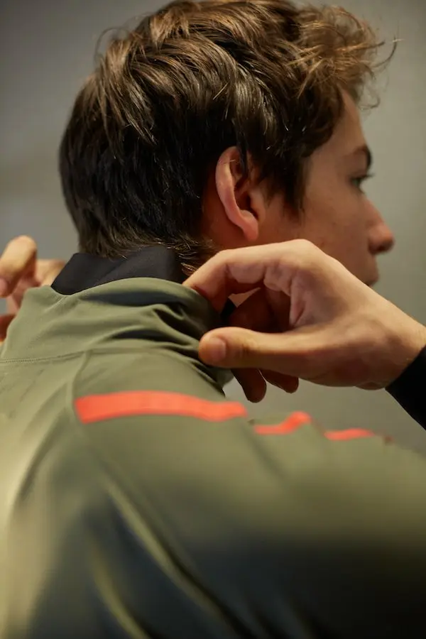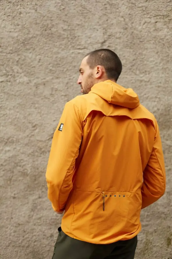 La veste Fiandre Medium est revue pour cette saison. Elle propose un montage avec la membrane Gore Infinium sur la partie avant, les bras et les épaules. Elle est complétée par un dos avec la technologie NoRain pour augmenter sa protection. Le détail qui fait la différence : le panneau arrière Gore Infinium qui n’est pas intégralement cousu et sert d’évent de ventilation en maille polaire micro perforée pour améliorer la respirabilité.