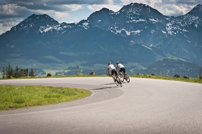 De nombreux cyclistes inexpérimentés se laissent glisser passivement dans une descente, les fesses sur la selle et en roue libre. En descendant doucement, l’esprit se laisse aller. Le temps de réaction en cas de problème est plus long. Vous manquez d’attention. Vous vous refroidissez. Une descente passive modifie les points d’appui sur le vélo et augmente les secousses dans tout le haut du corps. Même si la musculature est quasiment au repos pendant la descente, la fatigue s’accumule et vous avez les jambes coupées pour la montée suivante. Au contraire, en vous concentrant sur le pilotage, ça passe plus vite. Vous pédalez entre chaque virage, avec un gros développement pour accompagner la vitesse prise par le vélo. Après chaque virage serré, vous relancez en danseuse. Vous gagnez du temps et vous vous sentez plus en jambes pour la montée suivante. Il n’est pas nécessaire de disposer d’un énorme braquet en montagne, la pente étant suffisamment forte pour aller vite en prenant une position aérodynamique.