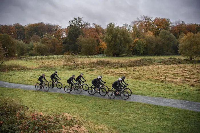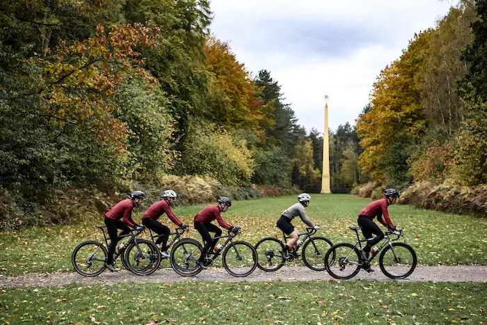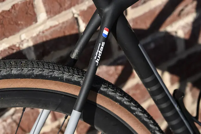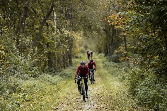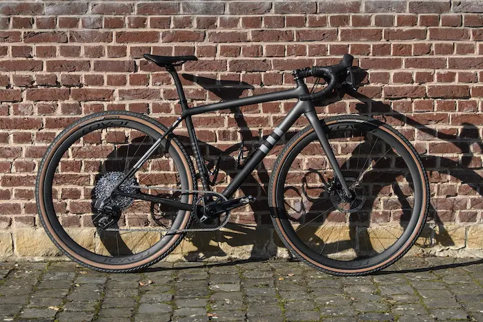 Sur terrain sec, nos compagnons de route, dont certains sont équipés avec des pneus de 42 mm au dessin plus agressif ne peuvent pas nous décrocher dans les virages. Les courbes s’enchainent idéalement, et il est rare de sentir l’une ou l’autre roue dériver légèrement, même en prenant de l’angle. Sur le mouillé, des pneus plus crantés prennent évidemment l’avantage, mais c’est la section des pneumatiques qui apporte surtout le plus de polyvalence au vélo. Sur ce genre de machine, il ne faut pas hésiter à monter à 42, 45, voire 47 mm pour être certain de passer partout, et avoir plus d’adhérence et de tenue sur la piste, dans les cailloux, sur les racines, ou dans la boue.