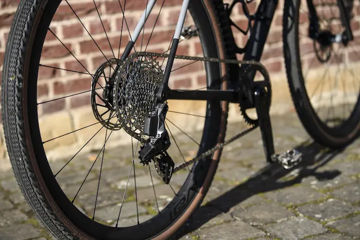 La simplicité des changements de vitesse avec un seul plateau et l’ergonomie des leviers Sram Rival AXS sont fort appréciables en tout-terrain, dans la boue, dans le sable, ou même dans les successions de passages techniques. Restent quelques trous dans la gamme, sensibles en bas et au milieu de la cassette en roulant à bonne allure sur les chemins, ou en faisant des incursions sur la route. Heureusement, une cassette 10-36 est aussi compatible avec cette transmission, pour une pratique cyclo-cross plus tonique qu’un usage Gravel, ou pour les plus sportifs d’entre nous.