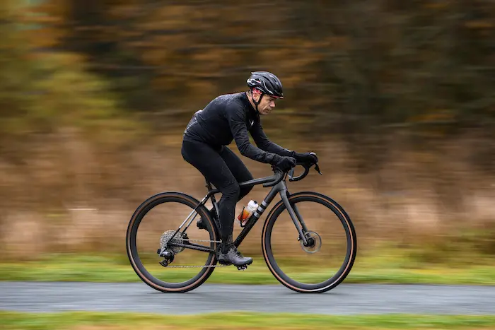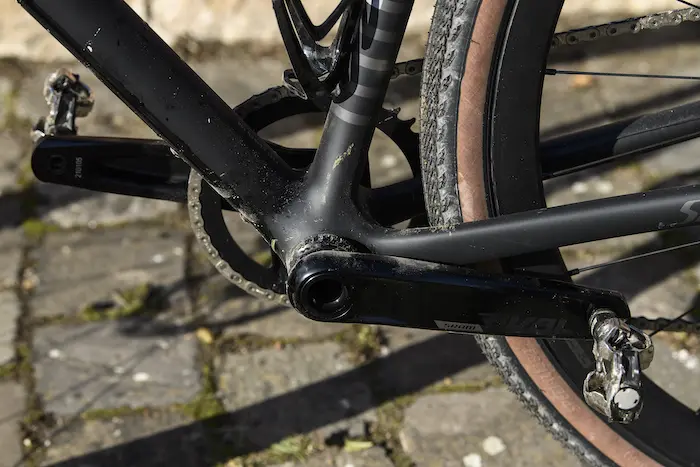 Sur les chemins bien tassés, le rendement global se montre excellent, avec des pneus qui offrent peu de résistance au roulement, malgré leur section de 38 mm et leur gonflage en dessous de 2 bar. En danseuse, un peu d’effet de pompage se ressent, mais cela reste dans l’esprit du vélo, qui se montre vif, dynamique, reptilien, et qui épouse les irrégularités du terrain pour vous permettre de maintenir une allure rapide et tonique. Il n’y a que sur les pavés, avec les secousses soutenues et régulières qu’ils imposent, que le Crux ne comble pas totalement le manque de technique du pilote. Il absorbe très correctement les vibrations, mais pour faire vraiment la différence sur ce type de revêtement, il faut savoir rouler vite tout en restant très décontracté au niveau du haut du corps.