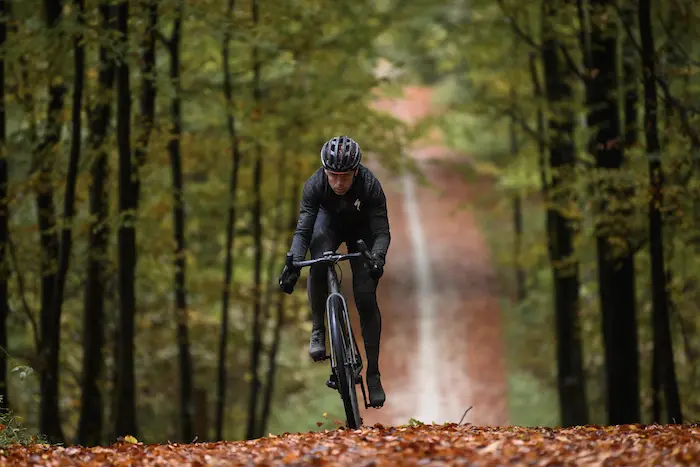 Au niveau de la géométrie, le Crux diffère là aussi du Diverge, avec un empattement moins prononcé, une boîte de pédalier légèrement rehaussée, mais un reach un peu plus important. L’idée est ici de mettre l’accent sur la maniabilité par rapport à un vélo de gravel pour longue distance, sans perturber la stabilité. Le Crux doit se montrer capable d’évoluer dans des dévers glissants, de sauter des planches, de tourner dans un mouchoir de poche entre deux arbres, tout en restant stable à bonne vitesse en descente en sautant des ornières. De ce fait, dans une version de série sans la moindre modification de composant, il procure une position sportive mais naturelle, et extrêmement rassurante dans les passages techniques malgré le cintre dit « de course ».