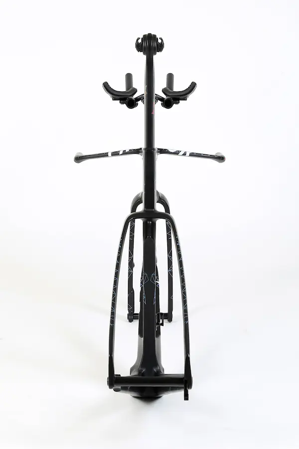 L’ensemble formé par la fourche et le cadre est ainsi le plus fin jamais conçu, vu de face. Les sections de profil aérodynamique sont appliquées sur toute la longueur de 16 cm permise par l’alignement de la douille de direction et du tube diagonal. La douille de direction est la plus étroite jamais conçue, ce qui forme une partie avant super fine avec la fourche.