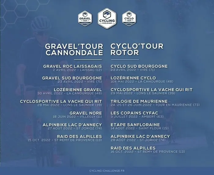 Après avoir rassemblé plus de 8700 participants lors de sa 1ère édition, le Cycling Challenge sera de retour en 2022. Ce challenge national, regroupant le Cyclo’Tour Rotor et le Gravel’Tour Cannondale, propose pour cette nouvelle année 10 manches de cyclosportives et 7 manches Gravel.