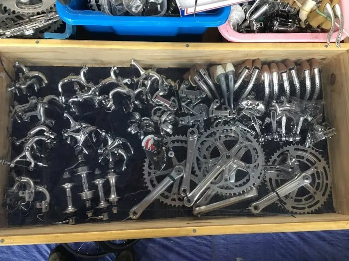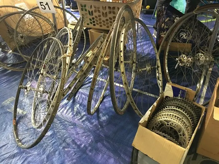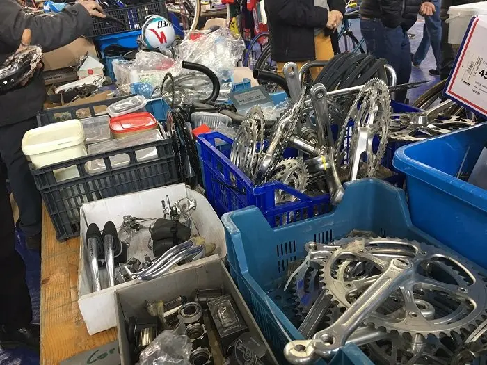 Des vélos à tous les prix, des groupes complets d’il y a quelques dizaines d’années, du neuf comme de l’occasion, des accessoires, des vélocistes comme des particuliers venus se débarrasser d’un stock devenu encombrant, des bouquinistes, des leviers de changement de vitesses au cintre en 9v à 5 €… il est possible de tout trouver sur cette bourse vélo.