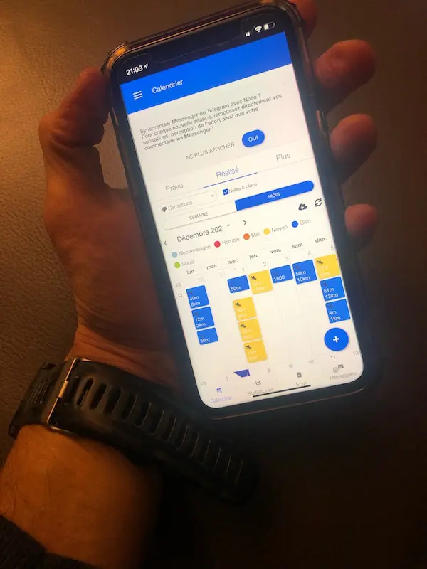 L’APPLI : L’appli est désormais la variante la plus moderne. Bien souvent, elle vous affiche déjà votre séance à l’avance, ou vous permet de la saisir ultérieurement, comme dans un DF. Vous pouvez même y associer des données externes telles que l’itinéraire qui directement s’enregistre par le GPS mais aussi la météo ou d’autres indications en lien avec ce pourquoi vous le faites. Et, si vous possédez un dispositif de suivi adapté, vous pouvez même croiser en direct tout un tas d’autres indications : température, altitude, allure, puissance, fréquence cardiaque, cadence, oscillation et rapport de verticalité si c’est de la course à pied et même l’équilibre du temps de contact avec le sol.