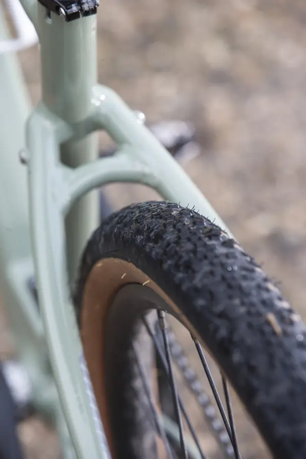 Les roues avec des moyeux Formula à l’avant et le moteur EbikeMotion à l’arrière, et leurs jantes Cannondale en alu à 28 et 32 trous reçoivent des pneumatiques WTB Resolute TCS de 42 mm de section. Un montage qui fait beaucoup pour la polyvalence du vélo. La section d’abord. Elle permet au vélo de s’approcher du comportement d’un VTT tout rigide des années 90, avec un amortissement suffisant sur de nombreux types de terrain grâce à la faible pression permise (autour de 1,8 bar pour ce qui nous concerne), qui offre pas mal d’accroche dans la boue et permet d’absorber les racines ou tranchées que l’on trouve dans les forêts du nord de la France. Les crampons ensuite. Ils sont peu profonds, ce qui évite une prise de poids inutile et ce qui permet à la boue de ne pas trop s’accumuler sur la bande de roulement. Mais ils restent bien présents sur l’angle, ce qui assure un bon contrôle dans les ornières ou sur les virages boueux. En termes de roulement, ils sont beaucoup moins handicapants que des purs pneus de VTT sur les parties rapides, et ils se défendent honorablement sur la route. Leur seul défaut, lié à leur section, à leur poids et à la faible pression, c’est qu’ils rendent la direction un peu lourde à basse vitesse, surtout lors des passages en danseuse.