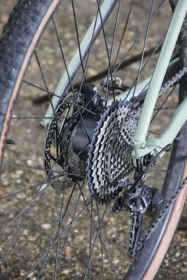 Évidemment, l’autonomie annoncée (jusqu’à 75 km) dépend du poids de l’utilisateur, du dénivelé et de la manière dont est utilisée l’assistance. En réalité, on peut obtenir bien plus en parcourant des chemins roulants et des parties bitumées, où la machine vous permet de dépasser aisément les 25 km/h à de fréquentes reprises. Et même si un mode d’assistance est enclenché, il se coupe automatiquement et de manière très douce une fois atteinte la vitesse limite, en préservant la batterie. Nous avons pu pour notre part cumuler deux sorties de 70 km et 600 m de dénivelé sans recharge, en utilisant seulement l’assistance dans les parties montantes et dans les parties très boueuses. Et si l’indicateur a fini par passer au rouge, il restait sans doute de quoi faire quelques kilomètres en utilisant le moteur. Une fois celui-ci totalement coupé, le poids du vélo devient particulièrement sensible, mais la géométrie sportive du vélo, ses grandes roues de 700c et son braquet minimal de 40/42 permettent toutefois de rouler toujours mieux qu’un VTT.