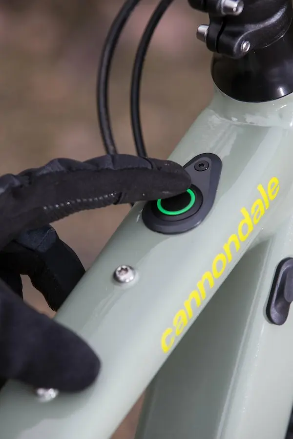 Trois modes d’assistance sont proposés avec chacun un code couleur (vert, orange, rouge) sur un bouton placé sur le tube supérieur du cadre. Le voyant lumineux affiche en continu le niveau de charge de la batterie : blanc = au-dessus de 75 %, vert = entre 50 et 75 %, orange = entre 25 et 50 % et rouge = en dessous de 25 %. En appuyant sur le bouton, le mode d’assistance est indiqué par une couleur clignotante : blanc = sans assistance, vert = niveau 1, orange = niveau 2, rouge = niveau 3. En appuyant brièvement sur le bouton pendant qu’il clignote, on passe d’un niveau d’assistance à l’autre.