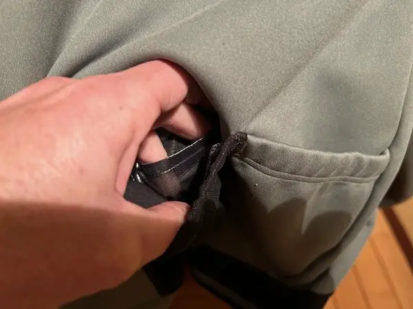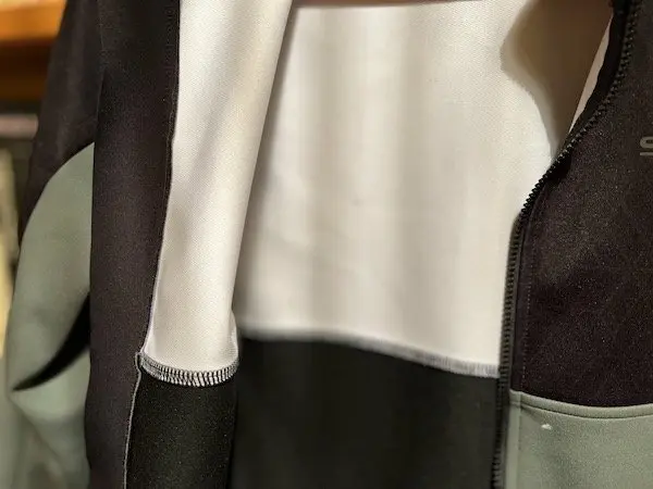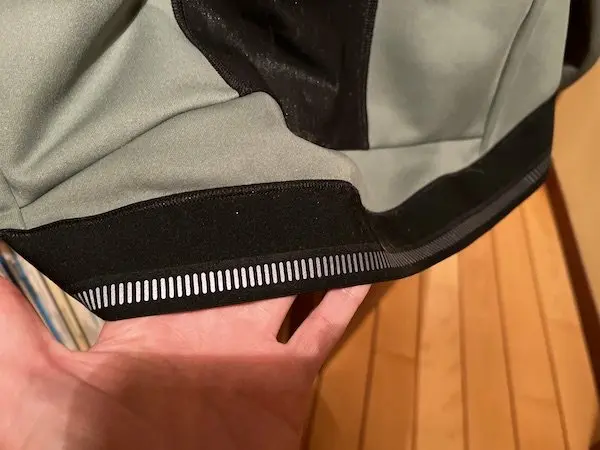 Sur le haut du torse et les épaules, une partie noire avec de petits motifs offre une protection coupe-vent supplémentaire. Le col haut et doublé évite les infiltrations d’air, tout comme les poignets élastiques et relativement longs. Le long zip avec un rabat intérieur procure une bonne isolation. Le système cam-lock YKK sécurise la fermeture, et un protège-menton évite les irritations. La bande élastique plate au bas du dos avec une doublure en silicone offre un bon maintien en position. Trois poches à l’arrière, dont une au milieu réfléchissante, et une poche intérieure anti-transpiration (malheureusement trop petite pour protéger le téléphone ou les papiers d’identité) complètent les fonctionnalités de la veste.