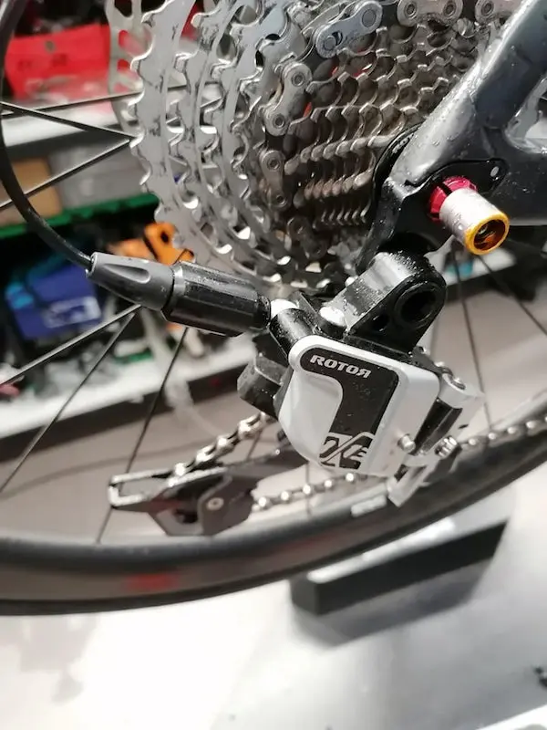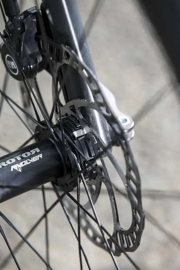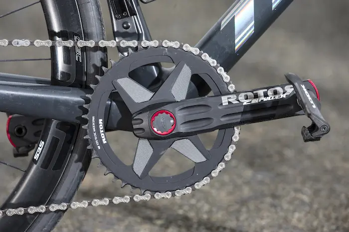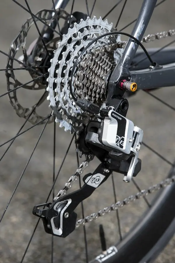 Avec son 1×13, Rotor propose un système de transmission original en mono plateau, et qui se révèle être le plus léger des groupes actuels avec des freins à disque. Le Rotor impose néanmoins le montage d’une roue arrière spécifique, et les changements de vitesse ne sont pas aussi fluides que la concurrence, malgré l’utilisation d’un système hydraulique.