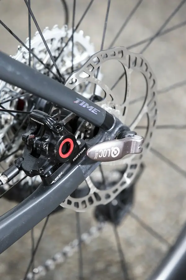 Mais le 1×13, aujourd’hui repris par Campagnolo avec son groupe Ekar dédié au gravel, n’est pas la seule des innovations proposées par Rotor, puisque dès 2016 la marque espagnole proposait un groupe avec une transmission hydraulique inédite, à la place d’une transmission par câble ou par fil électrique (ou sans fil dorénavant pour Sram et en partie pour Shimano). C’est donc sans surprise que Rotor utilise la même technologie sur son 1×13. L’hydraulique a l’avantage d’être complètement étanche entre la poignée et le dérailleur, de ne pas disposer de câble qui risque de gripper ou de rompre, et de ne pas nécessiter de recharge comme avec une batterie. Le système d’indexation se situe au niveau du dérailleur, ce qui lui évite de se dérégler, et un poussoir sur le mécanisme suffit pour le déplacer vers la droite au moment du démontage de la roue. Ce dérailleur est équipé d’une sorte d’embrayage pour le maintenir tendu en position, de manière à limiter les risques de sauts de chaîne au niveau du pédalier.