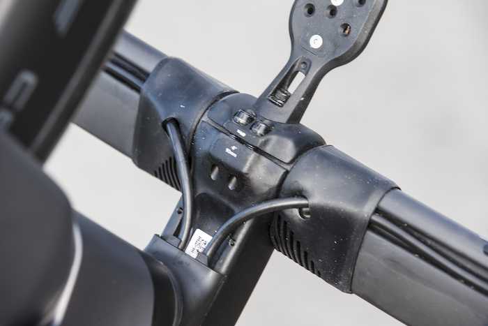 Un mot enfin sur les deux accessoires les plus spectaculaires, à savoir le bidon et la tool box, qui participent à l’allure si étrange du vélo, mais aussi sans aucun doute à son efficacité aérodynamique. Le bidon spécifique (et son porte-bidon) n’est pas si pratique à attraper ou à remettre dans son logement, surtout avec des gants d’hiver. Notons d’ailleurs qu’il ne contient que 500 ml (contre 600 pour la plupart des bidons du marché). La tétine fonctionne bien, mais elle a malheureusement tendance à fuir un peu sur les secousses. Avec un vélo tout propre, pour peu que le bidon soit rempli de sirop ou de boisson énergétique, on se retrouve rapidement avec des coulures pas très esthétiques sur le tube diagonal. Cela reste un détail, sachant qu’il est toujours possible de monter un ou deux porte-bidons classiques, au risque de perdre un peu de charme. Concernant la tool box, elle remplace tout simplement la sacoche de selle, et peut contenir ce qu’on peut mettre autrement dans la poche du maillot ou de la veste.