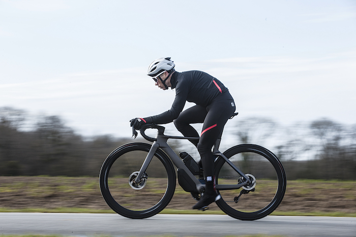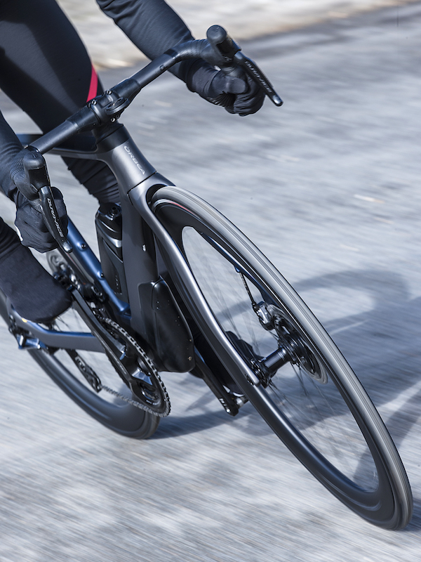 La forme des tubes et leur section ont d’abord été étudiées par ordinateur, pour optimiser les flux d’air autour du cadre, et minimiser ainsi la trainée du vélo. Lorsqu’on sait que la résistance de l’air est la principale force à contrer sur un vélo au-delà d’une vitesse de 20 km/h environ, ce travail est bien sûr prépondérant pour un vélo destiné à rouler vite. À partir de ces données, différentes maquettes ont été réalisées pour être testées en soufflerie, avant que les derniers prototypes ne soient finalisés après des tests sur un vélodrome, en comparant la puissance nécessaire pour rouler à une certaine vitesse. Car au-delà des contraintes aérodynamiques, le nouvel Orca Aero devait aussi répondre à des exigences de rigidité, afin d’offrir sur le terrain le meilleur rendement possible. La géométrie a également fait l’objet d’un travail particulier, pour offrir de la stabilité à haute vitesse, mais aussi une maniabilité qui fait parfois défaut sur ce type de machine. Pour ce faire, la boîte de pédalier a été légèrement abaissée pour diminuer le centre de gravité, mais l’empattement du vélo reste relativement court. Optimisé sur le plan aérodynamique pour des pneus de 25 à 28 mm de section (les pneus de 25 mm du vélo de test sont en réalité mesurés à 27 mm sur des jantes larges), l’Orca Aero accepte jusqu’à 30 mm de section, ce qui permet le cas échéant de gagner un peu de confort si nécessaire.