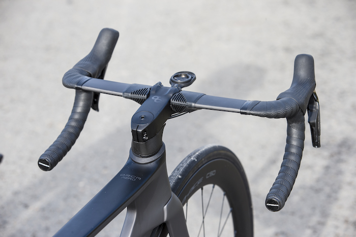 Le cintre très étroit au niveau des poignées (38 cm) offre curieusement un calage inattendu en position de recherche de vitesse, et il est suffisamment rigide et homogène avec le reste du vélo pour ne pas perturber le geste en danseuse lors des passages en force. Il est plutôt long au niveau de sa portée, entre la partie haute et les poignées, ce qui procure un excellent calage des avant-bras avec les coudes à 45° et les mains sur les cocottes. En revanche, avec les mains en bas, les avant-bras heurtent facilement la partie haute sur certaines relances. Il est même possible de donner des coups de genou lors de certains passages en danseuse, en raison de la largeur de sa partie supérieure, par ailleurs inconfortable pour les mains. Mais ce poste de pilotage permet de conduire une direction ultra précise et rassurante, pour placer le vélo au millimètre sans qu’on le sente louvoyer même en choisissant des trajectoires bien tendues.