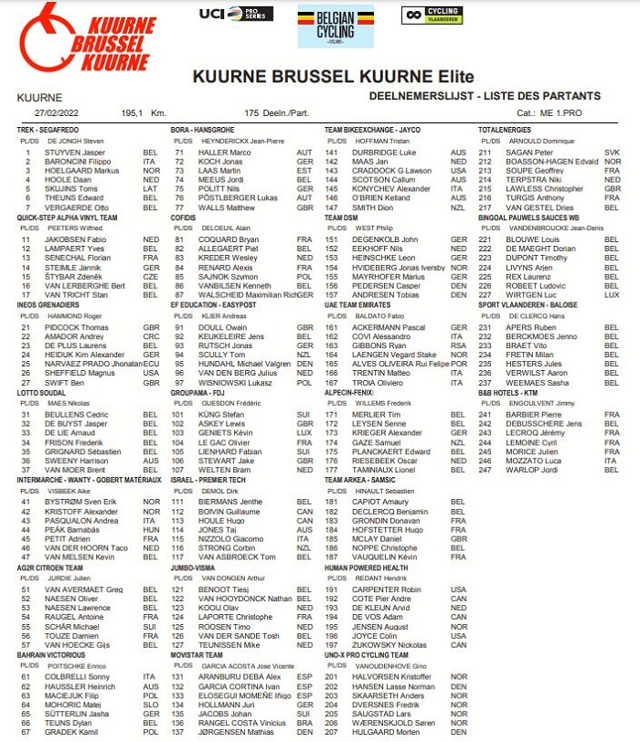 Les engagés sur Kuurne – Bruxelles – Kuurne 2022