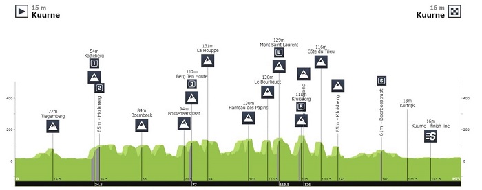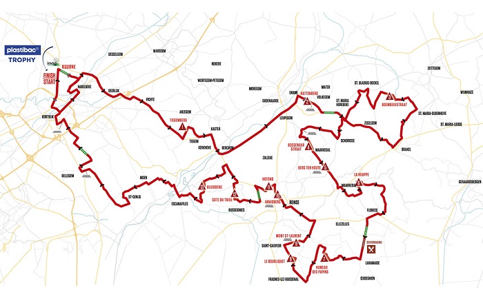Kuurne – Bruxelles – Kuurne est traditionnellement la deuxième course du calendrier professionnel belge, au lendemain du Circuit Het Nieuwsblad. Sur une distance avoisinant aussi les 200 km (195,1 km pour être précis), le parcours fera la part belle aux bosses raides et aux portions pavées. Quelques ajouts sont proposés cette année avec quatre nouvelles côtes (sur les 13 au total). Il s’agit du Kattenberg, le Berg Ten Joute, le Hameau des Sapins et le Bourliquet feront leur apparition.