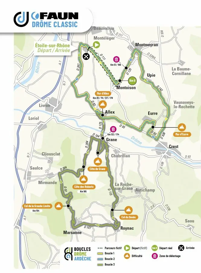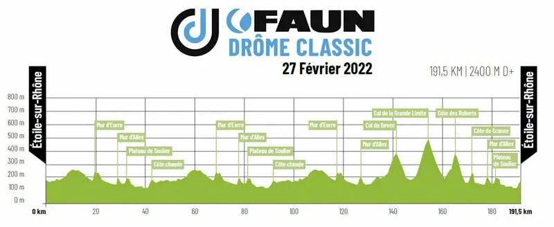 La 10e édition de la Faun Drôme Classic – ou Drôme Classic – se tient dimanche 27 février 2022 au départ d’une nouvelle ville-hôte : Étoile-sur-Rhône. Le parcours escarpé de 191,5 km et 2400 mètres de dénivelé positif se déroule au cœur du Val de Drôme. Le peloton va traverser les villages perchés de la Drôme et gravir plusieurs côtes redoutables dont les murs d’Allex et d’Eurre.