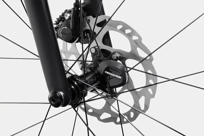 Le système complet SmartSense est composé de deux éclairages avant et arrière intelligents et d’un radar arrière, alimentés par une seule batterie. L’ensemble peut être relié à l’application Cannondale, afin de personnaliser certains paramètres, pour que le cycliste puisse voir et être vu sur la route de manière plus efficace. Lancer la roue avant équipée du capteur de roue Cannondale suffit pour mettre en route tous les éléments du système SmartSense.